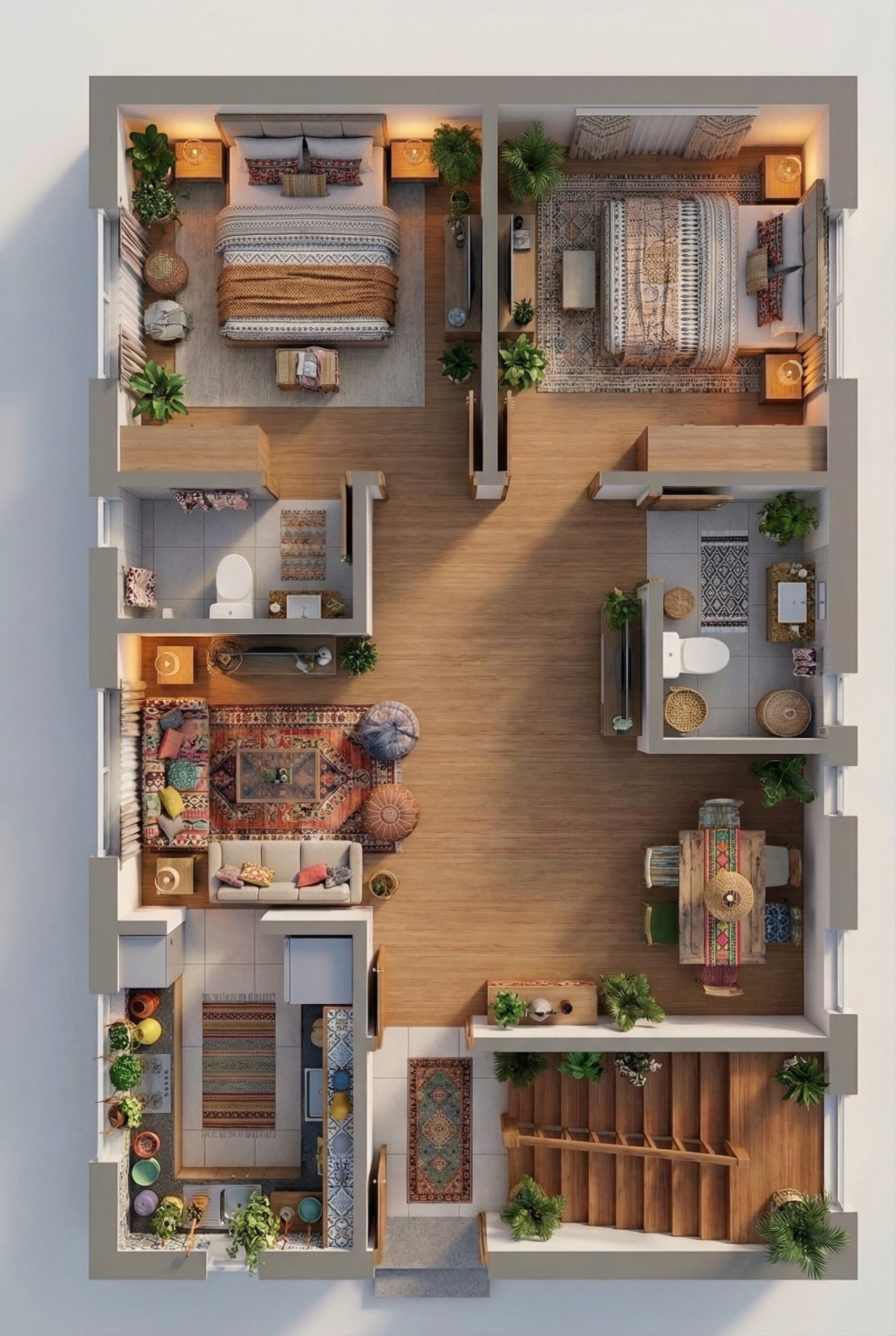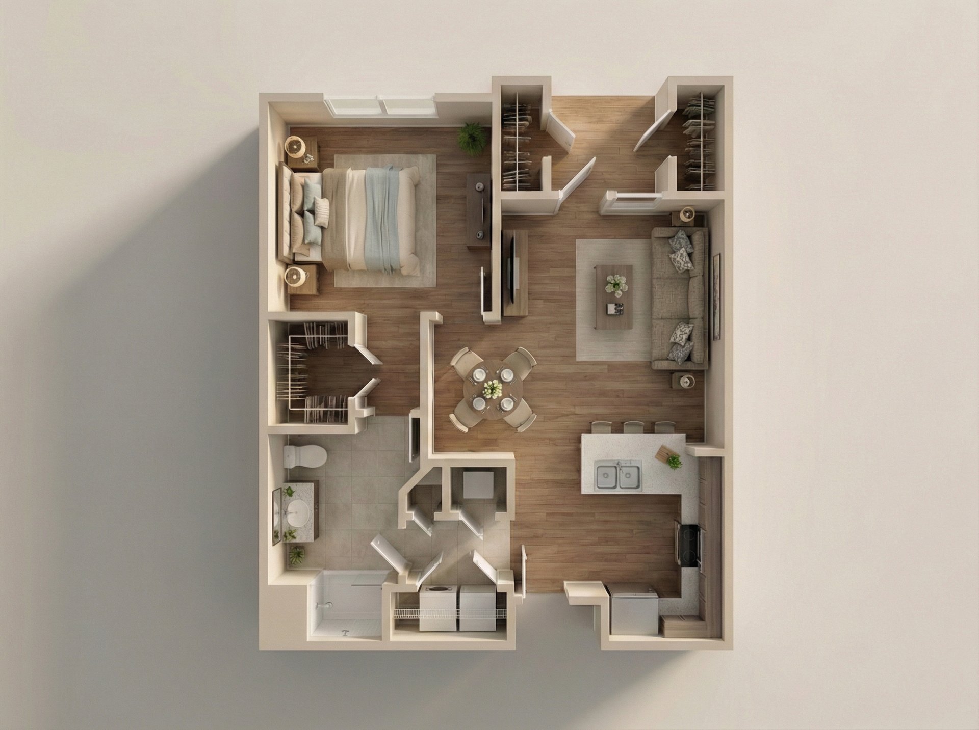 Transform a 2D floor plan into a 3D photorealistic render. This tool builds the space from your layout with accurate proportions and design details.