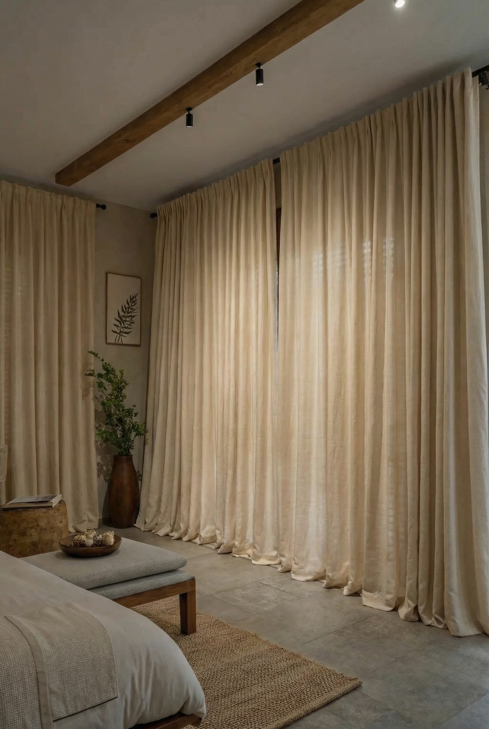 Adjust curtain styling and position by selecting from open, half-drawn, or closed. This tool modifies the drapes while maintaining fabric texture and natural light interaction.